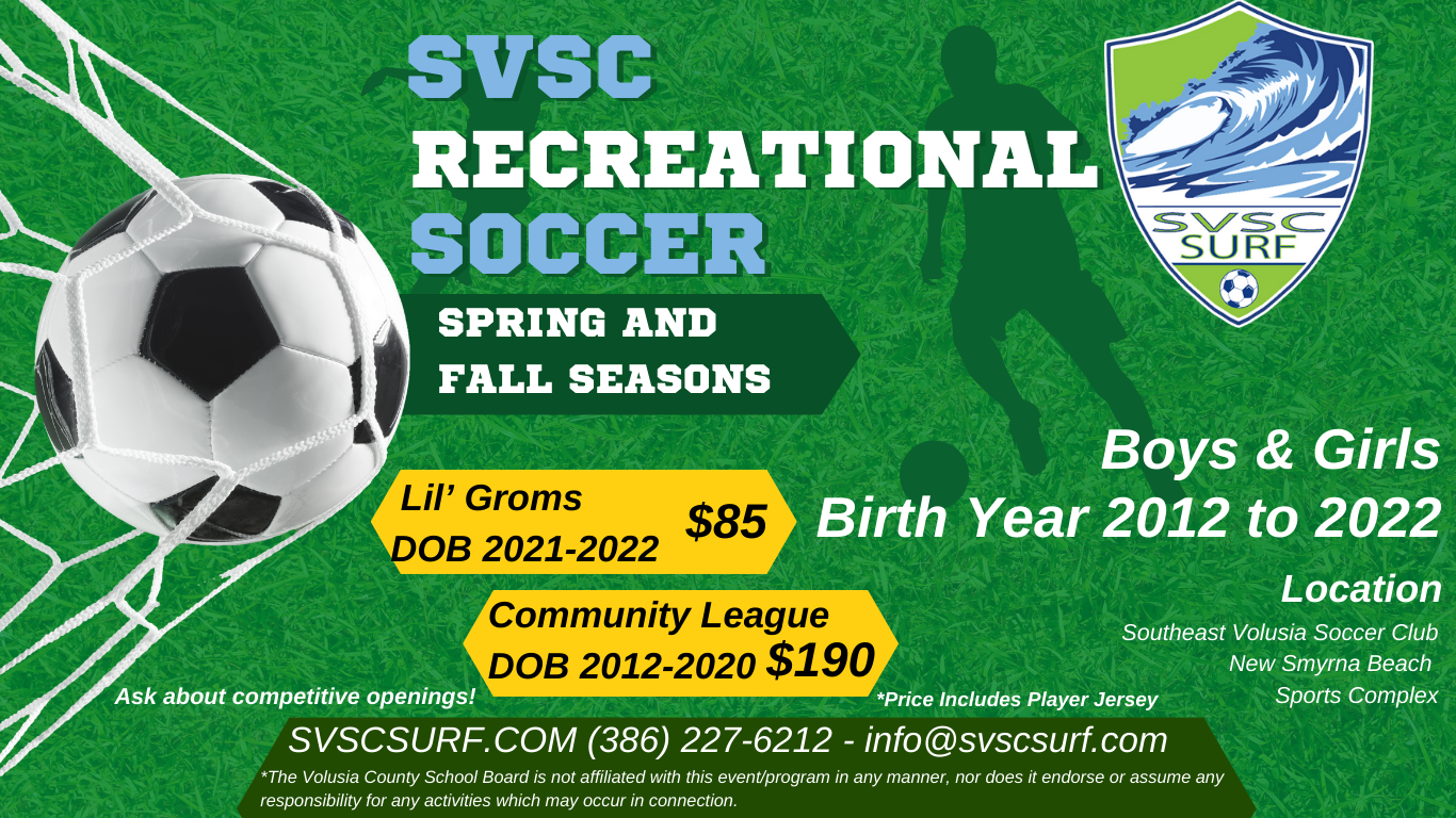 All practices and games occur at the New Smyrna Beach Sports Complex located at 1800 Turnbull Bay Rd in New Smyrna Beach, FL 32168.